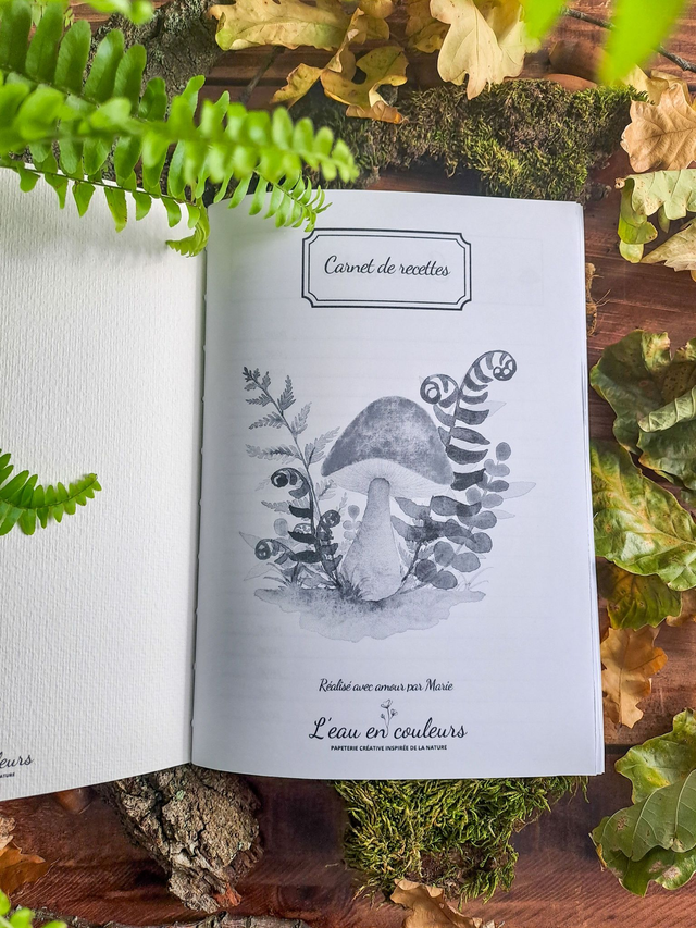 Il est composé à l'intérieur de 56 pages en papier blanc fabriqué en France et certifié FSC (100g/m²). La couverture, en papier coton texturé (210g/m²), est imprimée à partir de mes aquarelles originales avec la technique jet d'encre permettant un rendu des couleurs et des détails de haute qualité. Il est relié par mes soins avec du fil de lin ciré.