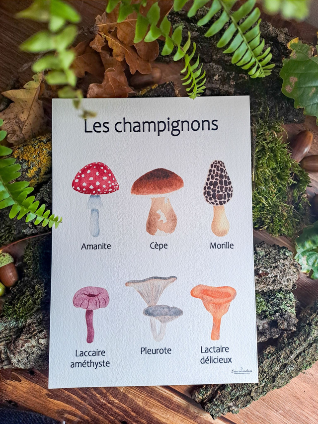 Affiche Fine Art représentant les champignons que l'on peut trouver lors de nos balades en forêt. Parfaite pour décorer son intérieur. A offrir ou à s'offrir.