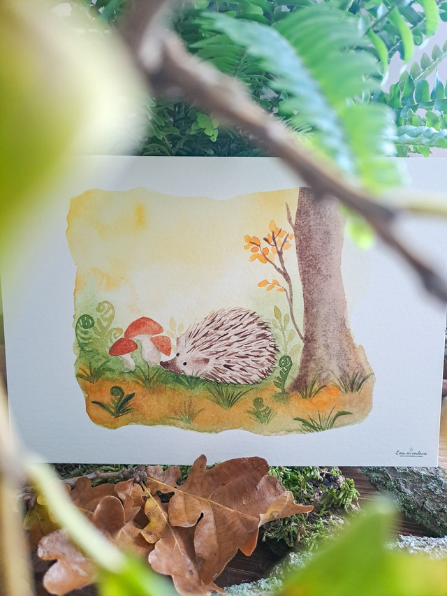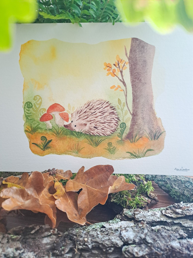 Affiche Fine Art représentant un charmant petit hérisson que l'on peut espérer apercevoir lors de nos balades en forêt. Parfaite pour décorer son intérieur. A offrir ou à s'offrir.